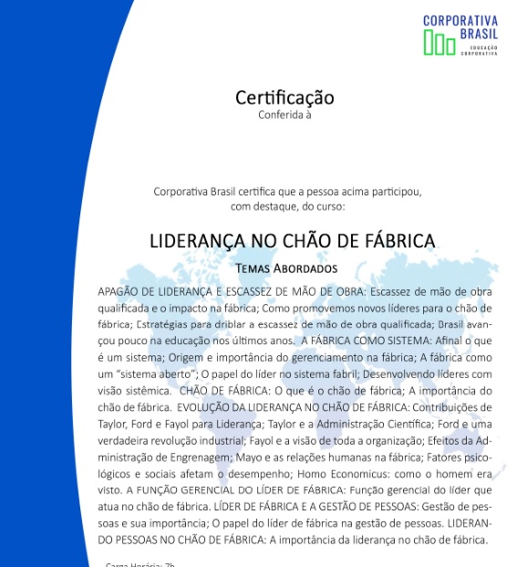 Capacitamos nossa equipe de gestão por meio de um curso especializado em liderança, com maior foco no chão de fábrica, investimos no desenvolvimento profissional e pessoal de nossa equipe.